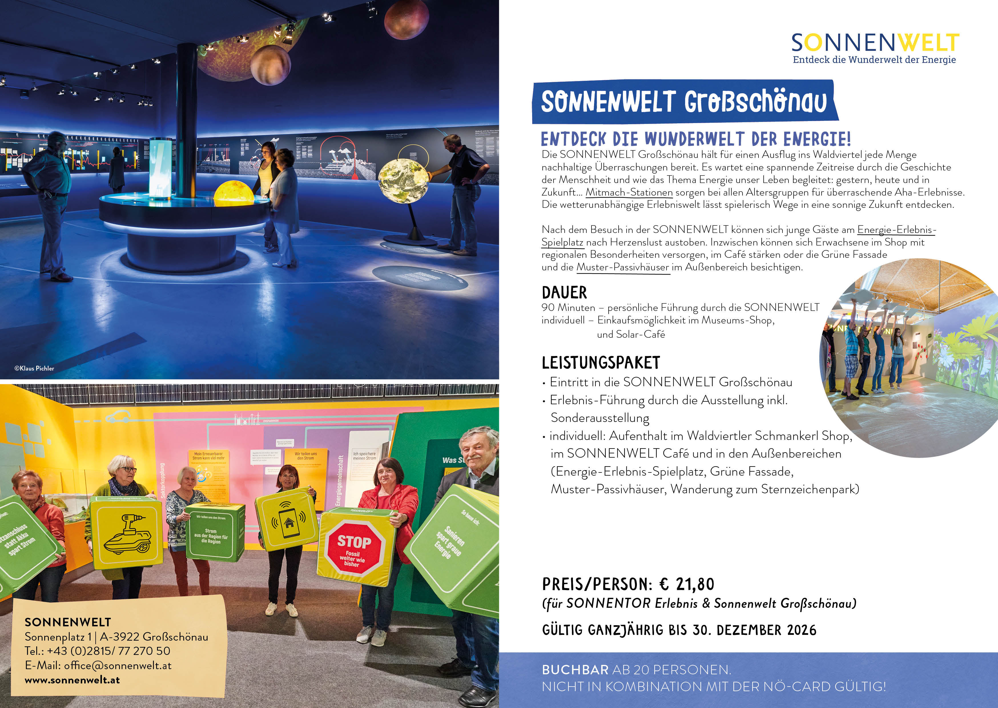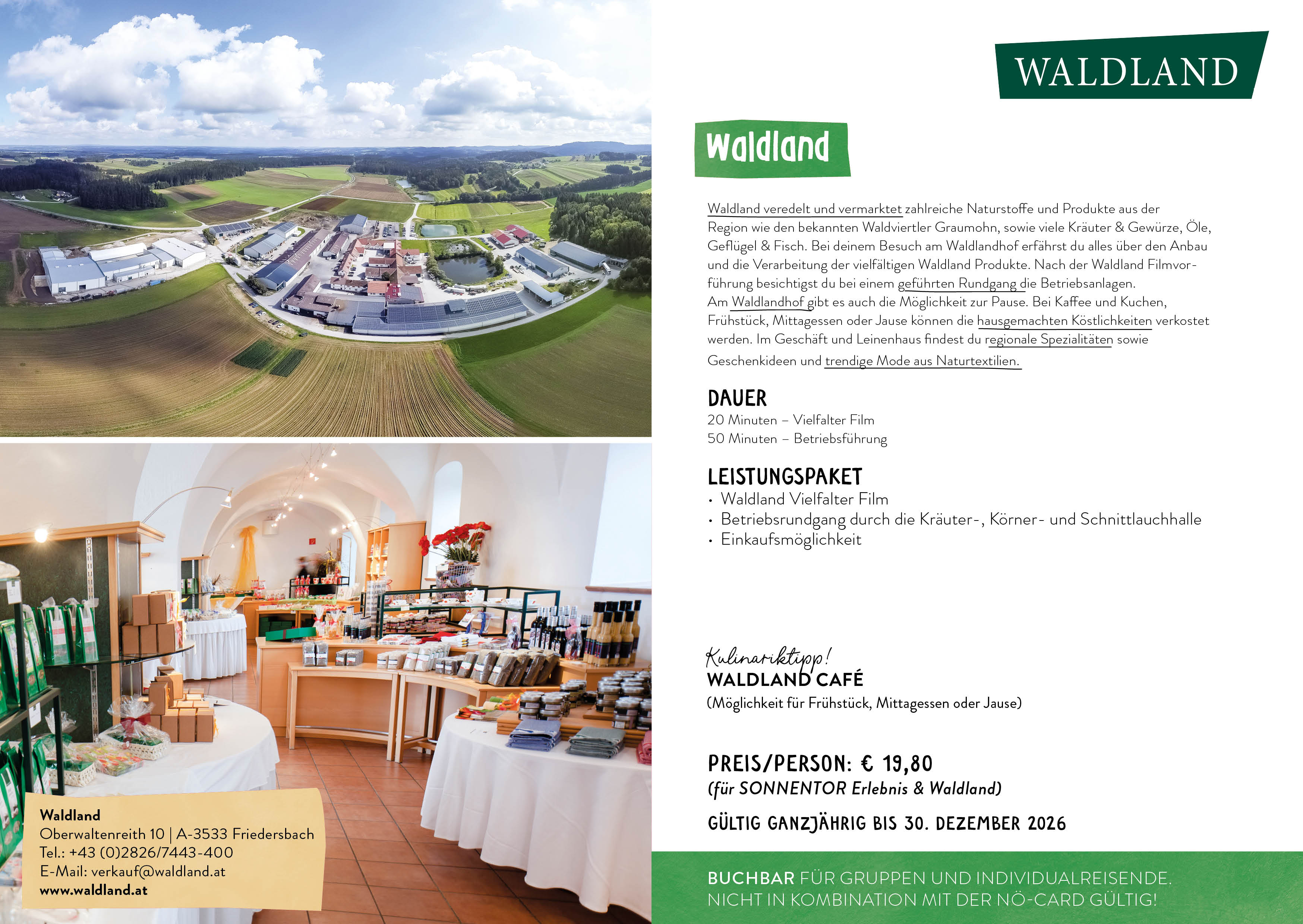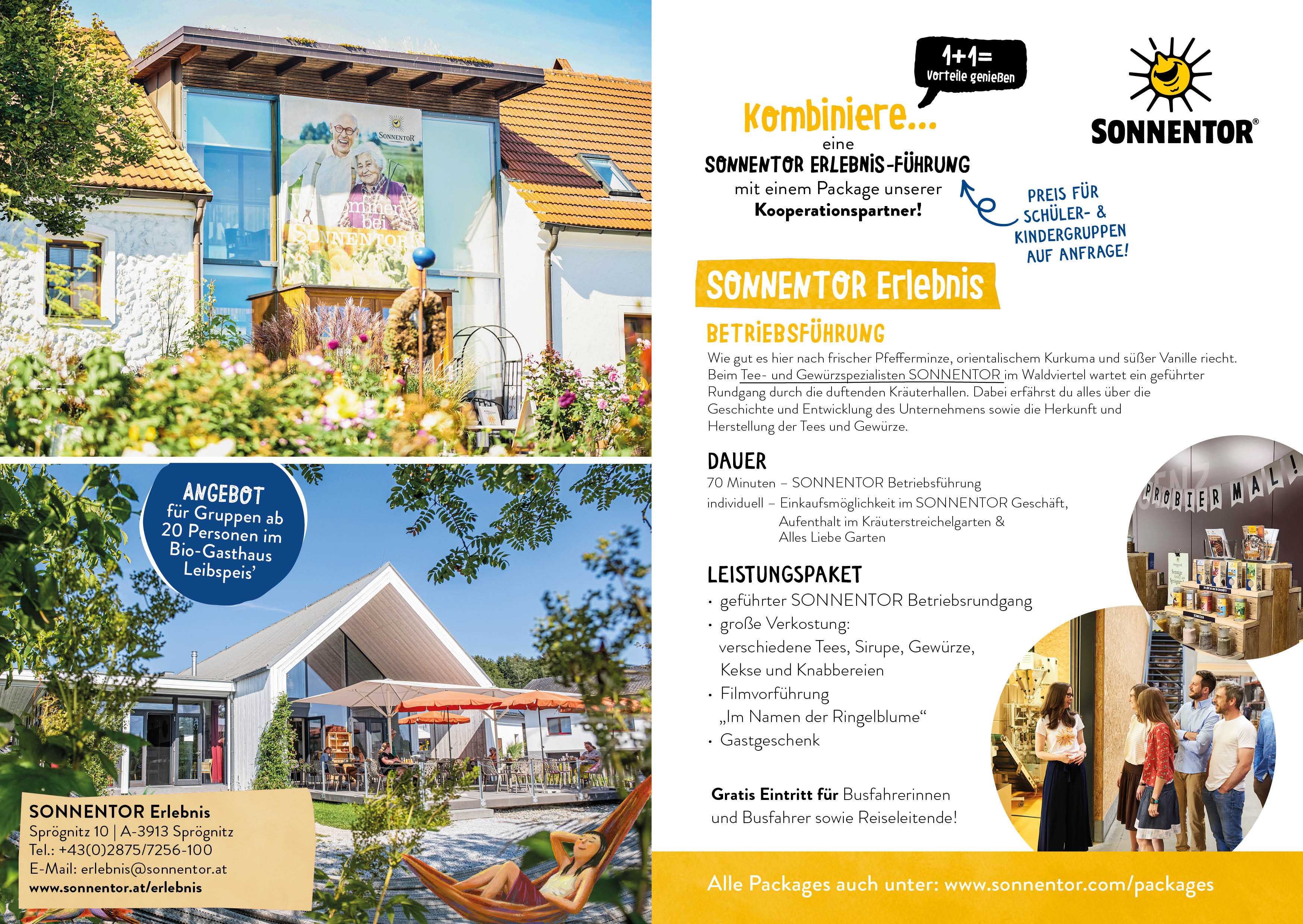 Erlebe das Waldviertel bei deiner Gruppenreise auf vielfältige Weise. Verbinde deinen Besuch bei SONNENTOR mit den besten Ausflugszielen der Region und sichere dir exklusive Vorteile. Stelle dir dein Programm ganz einfach im Baukastensystem zusammen – wähle eine Führung bei SONNENTOR und kombiniere sie mit einem Angebot unserer Gruppen-Package-Partner.