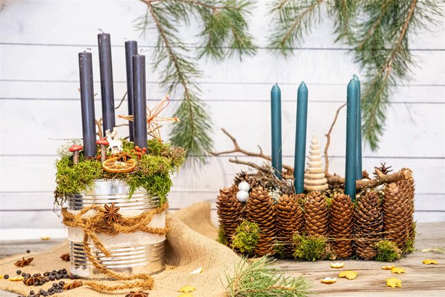 Auch die Kerzen sind bereits im Preis enthalten. Du kannst aus unterschiedlichen Formen und Farben wählen und damit deiner Gestaltung den letzten, persönlichen Akzent geben. Ein Workshop voller gemütlicher Atmosphäre, natürlicher Materialien und kreativer Freude – perfekt, um in den Advent einzutauchen.