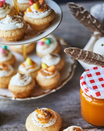 Auf dem Foto ist eine Etagere zu sehen mit vielen Cupcakes darauf. Daneben steht ein Marmeladen Glas und auch Federn sind zu sehen. | © SONNENTOR