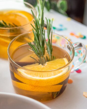 Anschließend den Punsch in Tassen/Gläser füllen und mit den Orangenscheiben, den Zimtstangen, dem Rosmarin garnieren und heiß servieren.