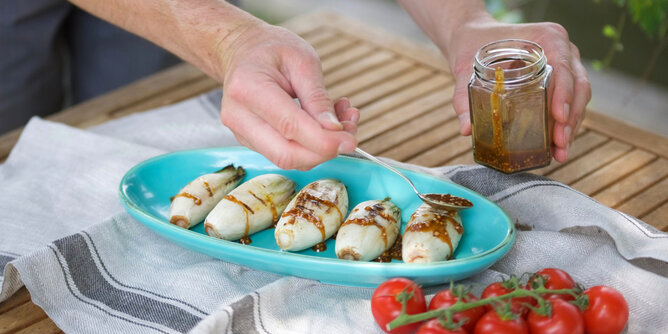 ZubereitungDie Chicoree Herzen kurz bei großer Hitze grillen, damit an der Außenseite ordentliche Röstaromen entstehen, im Inneren sollte der Salat aber immer noch knackig bleiben. Für die Marinade